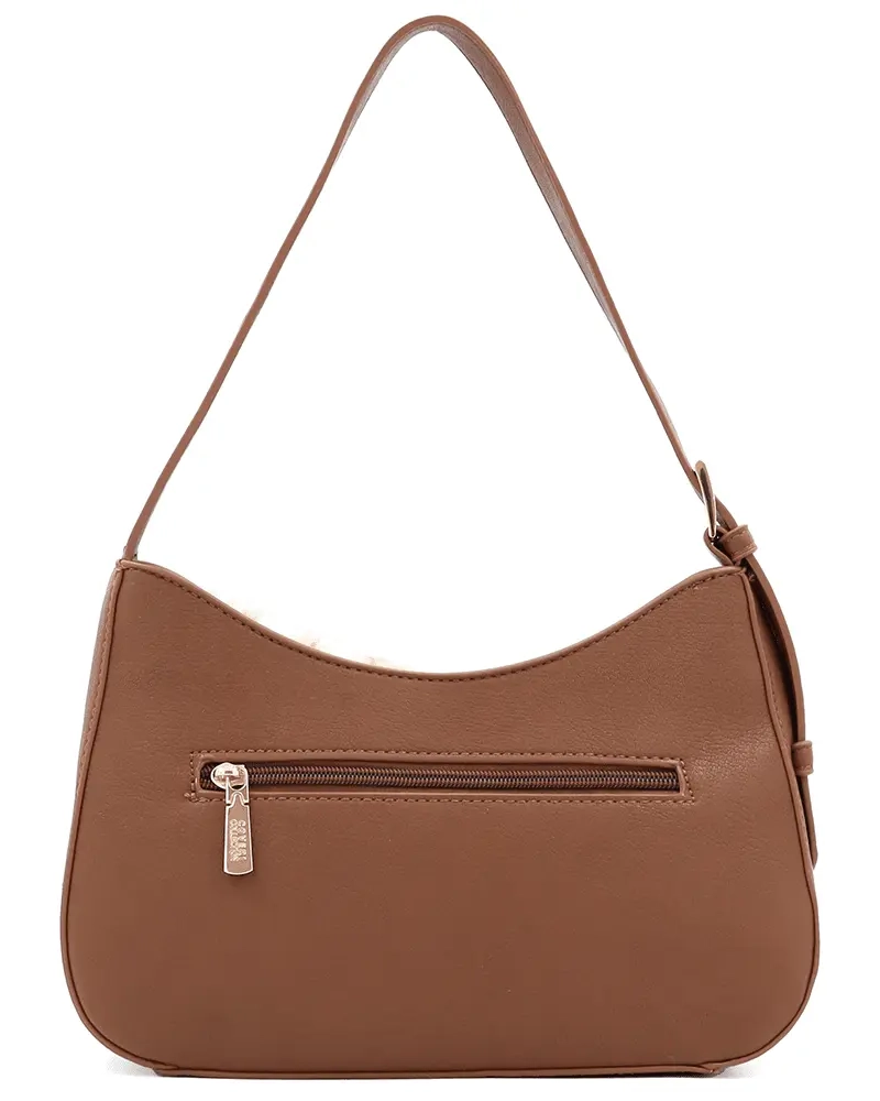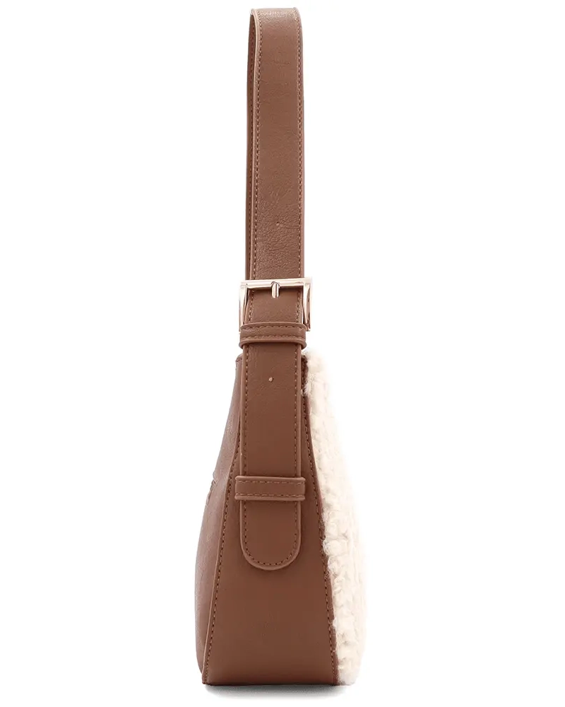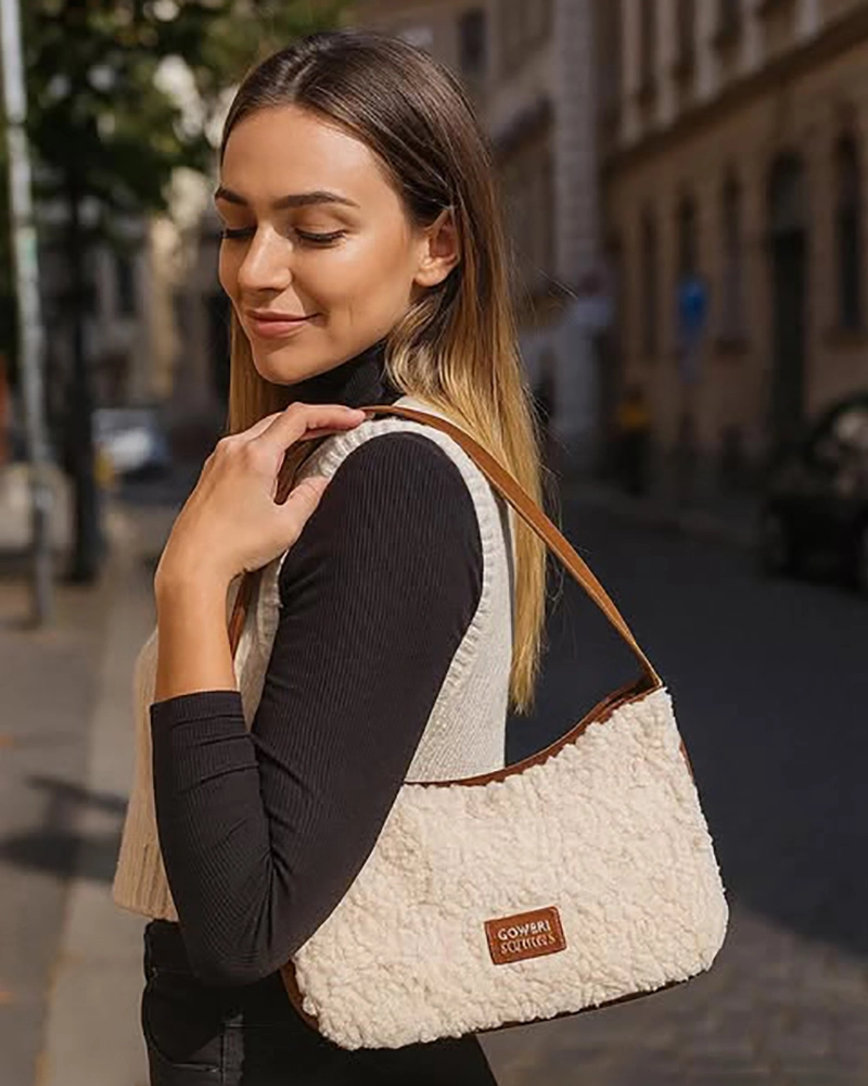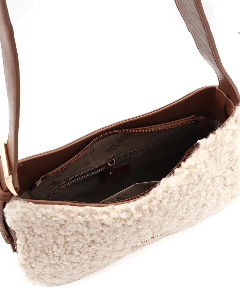 Модерна дамска чанта букле тип хобо (hobo bag) в топъл бежов нюанс. Съчетава изискан дизайн с практичност , размера е среден . Лицевата част е изработена от плюшен текстилен материал с богата текстура, докато дръжката и детайлите са от висококачествена еко кожа. Аксесоарите в златист цвят предават лукс и изисканост. Практичноста на модела идва от функционото разпределение на джобовете. Едиин основен с вътрешни допълнителни прегради и външен джоб с цип. Перфектна за дневна употреба, тази чанта съчетава както ежедневни, така и по-елегантни визии. Меката букле текстура придава топлина и уют, а неутралния цвят я прави лесна за комбиниране с различни тоалети.