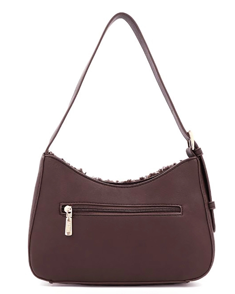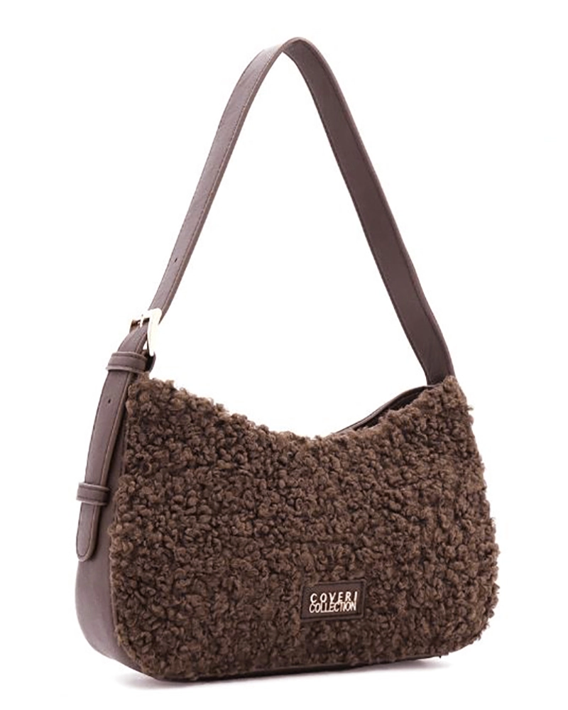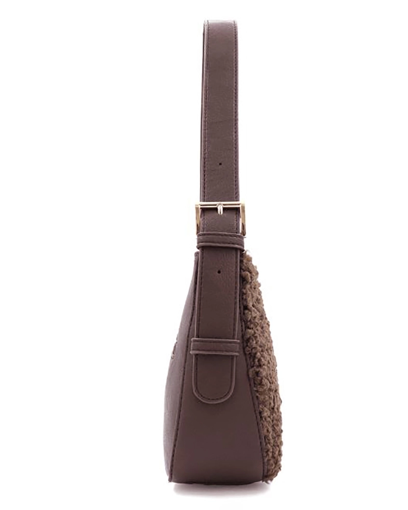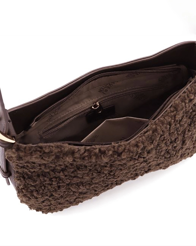 Модерна дамска чанта букле тип хобо (hobo bag) в топъл кафяв цвят. Съчетава изискан дизайн с практичност , размера е среден . Лицевата част е изработена от плюшен текстилен материал с богата текстура, докато дръжката и детайлите са от висококачествена еко кожа. Аксесоарите в златист цвят предават лукс и изисканост. Практичноста на модела идва от функционото разпределение на джобовете. Едиин основен с вътрешни допълнителни прегради и външен джоб с цип. Перфектна за дневна употреба, тази чанта съчетава както ежедневни, така и по-елегантни визии. Меката букле текстура придава топлина и уют, а неутралния цвят я прави лесна за комбиниране с различни тоалети.