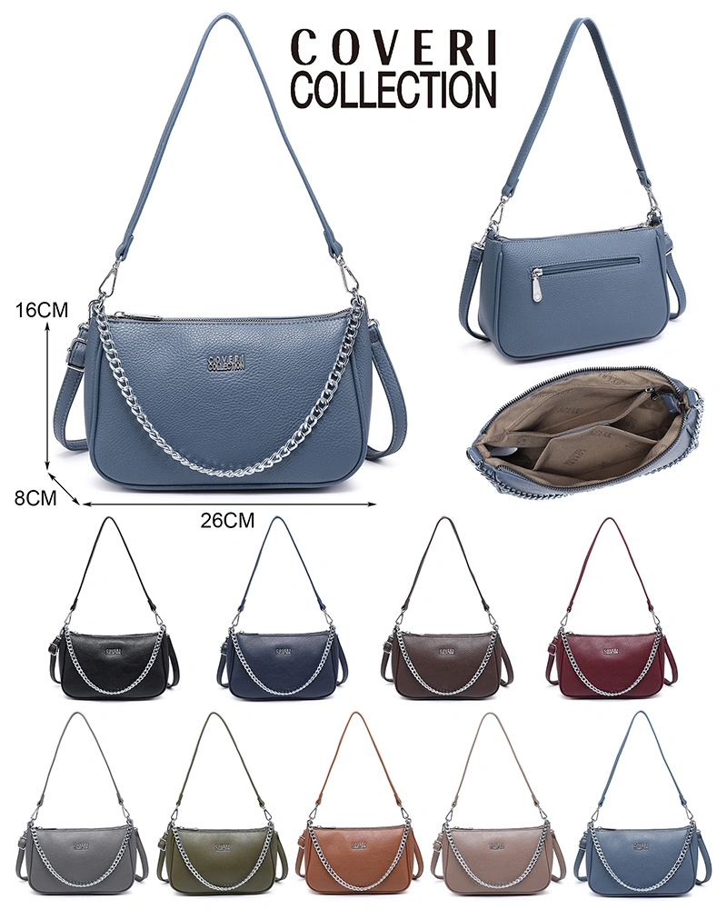 Елегантната кафява дамска чанта COVERI е създадена за жени, които ценят практичността и съвременния стил. Изработена от висококачествена еко кожа с хастар от брандиран текстил и детайли от сребристи аксесоари. Моделът впечатлява със своя изчистен силует и сребриста плочка с лого – COVERI, която гарантира автентичност и премиум изработка. Този модел е сред водещите предложения в категорията дамски чанти и е идеален избор при търсене на дамска чанта онлайн. Компактната форма предлага удобство без компромис с капацитета – малка функционална чанта, която може да се използва и като дамски клъч. Разполага с едно основно отделение с 2 прегради и джоб, както и външен джоб с цип за бърз достъп до най-необходимите принадлежности. Подходяща за ежедневие, офис, вечеря и пътуване, тя допълва всяка модна визия. Дизайнът е модерен, елегантен и функционален, с ясна естетика и внимание към детайла. Предлага допълнителна дълга регулируема дръжка, къса дръжка и синджир, който служи едновременно като дръжка и моден акцент. Производителят COVERI – Italy е доказателство за висок стандарт и надеждност при изработка на кожена дамска чанта.